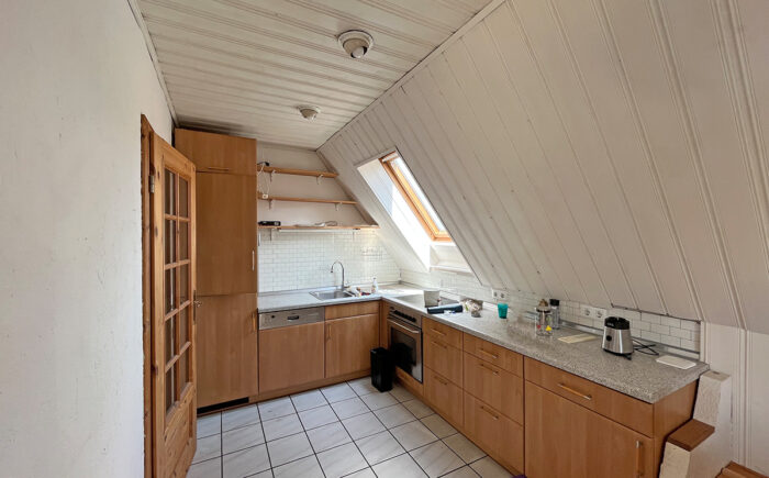 Kirschholzparkett versehen. Eine hochwertige Einbauküche im EG kann mit erworben werden (nicht im Kaufpreis enthalten). Die geschmackvoll gestalteten Holzfenster passen stilistisch sehr schön zum Objekt. Ein großzügig